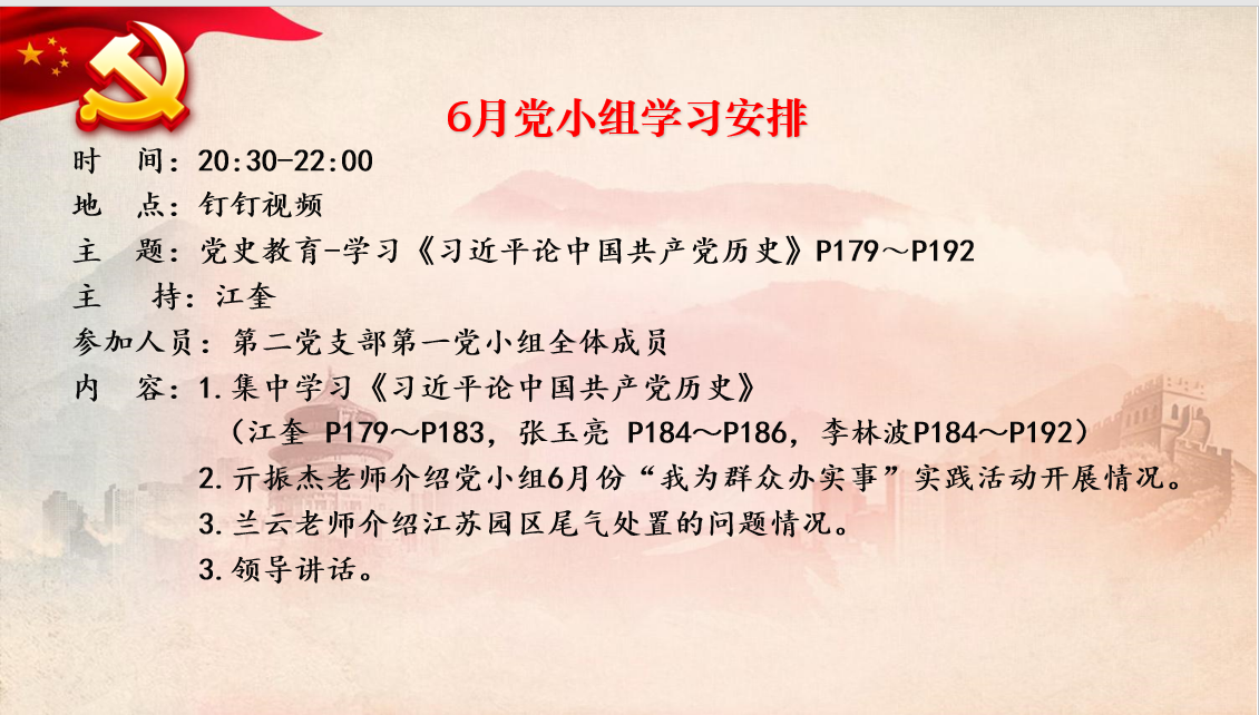 6月20日晚,第二党支部第一党小组通过钉钉视频会议的形式,开展了6月份党史教育学习。