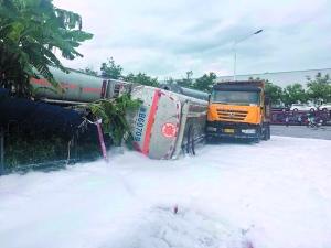 据了解,侧翻的油罐车内储存有15吨柴油,事故造成5吨柴油泄漏。