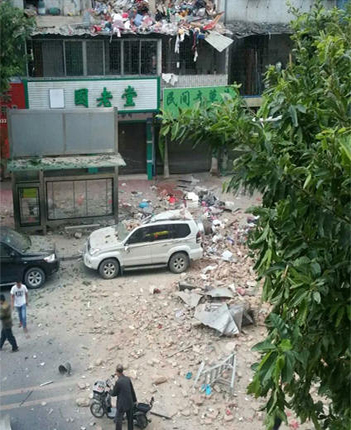 今日清晨6时19分,广州花都区新华镇商业大道84号一住宅小区3楼的一户住房发生煤气爆炸,整个小区一片狼藉,到处都是玻璃碎,靠路的墙体都掉下来了,砸到了路边的几台车,对面马路的建筑玻璃也震碎了。