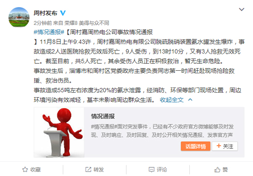 齐鲁网淄博11月8日讯 11月8日上午9:43许,周村嘉周热电有限公司脱硫脱硝装置氨水罐发生爆炸,事故造成2人送医院抢救无效后死亡,9人受伤,到13时10分,又有3人抢救无效死亡。截至目前,共5人死亡,其余受伤人员正在积极救治,暂无生命危险。