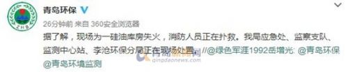 对于此事,今天13时,青岛环保官微作出回应称,据了解,现场为一硅油库房失火,消防人员正在扑救。我局应急处、监察支队、监测中心站、李沧环保分局正在现场处置。