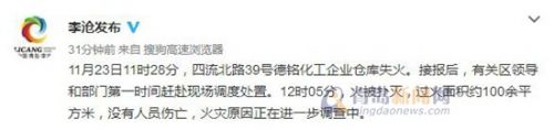 李沧发布官微表示,11月23日11时28分,四流北路39号德铭化工企业仓库失火。接报后,有关区领导和部门第一时间赶赴现场调度处置。12时05分,火被扑灭,过火面积约100余平方米,没有人员伤亡,火灾原因正在进一步调查中。