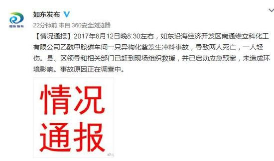 据江苏如东县委宣传部官方微博“如东发布”消息,昨天(8月12日)晚8点30分左右,如东沿海经济开发区南通维立科化工有限公司乙酰甲胺磷车间一只异构化釜发生冲料事故,导致两人死亡,一人轻伤。