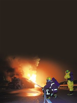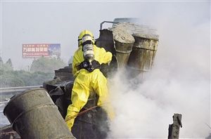 湖州市消防支队参谋长张阳明告诉记者,消防官兵是在凌晨1点40分赶到现场的。由于黄磷有剧毒,消防官兵必须穿轻型防化服,戴面罩,背上空气呼吸器才能前往100米开外的现场扑救。由于黄磷只有密封在水中才不会燃烧,所以消防队员要持续不断地对着车子喷水。一直到上午10点半,明火才被扑灭。