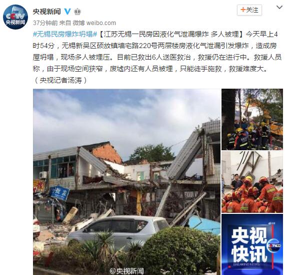 人民网北京9月19日电 据中央电视台新闻中心官方微博消息,今天早上4时54分,无锡新吴区硕放镇墙宅路220号两层楼房液化气泄漏引发爆炸,造成房屋坍塌,现场多人被埋压。目前已救出6人送医救治,救援仍在进行中。救援人员称,由于现场空间狭窄,废墟内还有人员被埋,只能徒手施救,救援难度大。