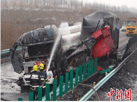 1月15日清晨,新疆昌吉州阜康市吐乌大高速公路天池立交桥往乌鲁木齐方向1公里处发生一起三车相撞交通事故,致使一辆载有4000立方米天然气的槽车发生泄漏,并导致两人受伤,一人