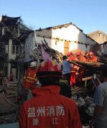现场救援。 8月28日凌晨4时58分许,苍南县宜山镇鱼池街80号对面一民房疑似因燃气爆炸发生倒塌。截止记者发稿时,已有四名被困人员被救出,并送往医院救治。 据现场知情人士介绍,