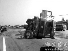 图为:事发现场 (记者周逸雄摄) 14日中午11时50分许,一辆大型槽罐车正在三环线三金潭立交桥往谌家矶方向行驶,突然一名女子推着三轮车横穿马路。槽罐车司机为避让女子,猛打方向