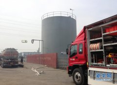 7月26日,消防人员在泰兴市氨水储罐泄漏事故现场抢险。 当日7时左右,江苏省泰兴市经济开发区易初化工有限公司一300吨氨水储罐发生泄漏事故,造成附近数人氨气中毒。该储罐于1