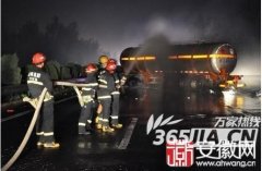 图为救援现场 7月28日凌晨2时06分,在蚌埠怀远县境内的宁洛高速上,一辆运载危险品的河南籍槽罐车撞断路边近10米的铁护栏,险些冲入路边沟内造成危化品泄漏,事故造成一人受伤严