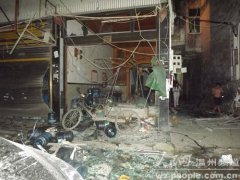 事故现场 人民网温州5月24日电 随着一声巨响,一店门直接被炸飞。昨晚10时20分许,温州苍南龙港镇龙洲东路上一家煤气销售点发生爆炸,造成4人受伤,目前已在医院救治。 事发现场