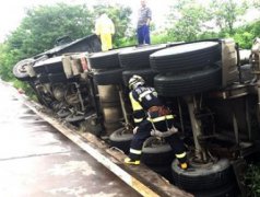 8月29日上午,四川德阳绵竹市某公司附近公路上,一辆装有30吨浓硫酸的槽罐车发生侧翻并泄漏,现场情况十分紧急。 因雨天路滑,一辆装有浓硫酸的槽罐车四脚朝天侧翻在公路边,罐