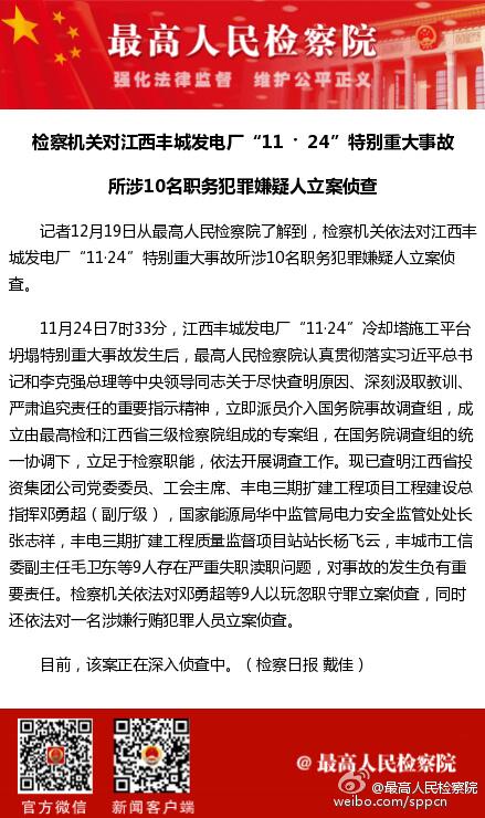 据最高人民检察院微博消息,检察机关已依法对江西丰城发电厂“11·24”特别重大事故所涉10名职务犯罪嫌疑人立案侦查。