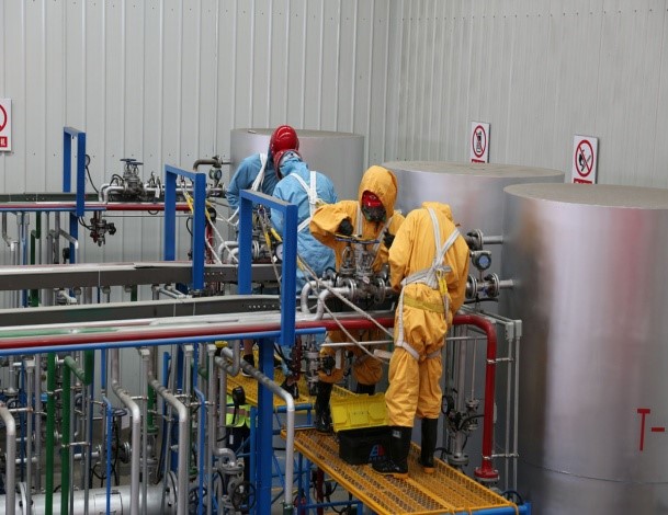 多种危化品生产工艺安全操作考核分为三个部分:一是考核对装置的熟悉程度以及现场的安全隐患排查,在装置现场设置5大类20个隐患排查点;二是化工工艺安全操作内容考核,包含接班考核内容和事故或故障操作考核两个部分,模拟化工企业日常作业的相关内容;三是安全文明生产,主要是参赛选手在考核过程中的操作规范、安全作业以及现场纪律方面的评判,参赛选手需规范操作、安全作业、文明生产。图4为B项目考核现场。