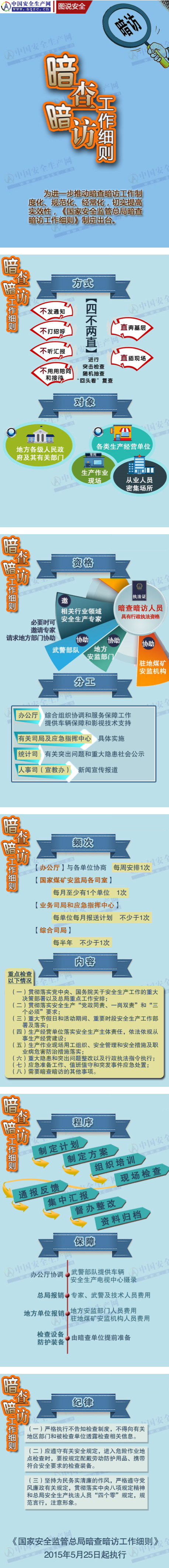为进一步推动暗查暗访工作制度化、规范化、经常化,切实提高实效性,制定了《国家安全监管总局暗查暗访工作细则》。现印发给你们,请认真遵照执行。