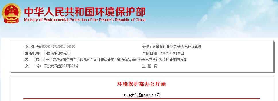 日前,环保部下发关于开展燃煤锅炉与“小散乱污”企业排放清单排查及落实重污染天气应急预案项目清单的通知。通知提出,对未列入本次排查清单中的企业,今后一经发现,一律关停,并依法依规追究相关部门和人员责任。通知要求,各地应于3月15日前完成燃煤锅炉、“小散乱污”企业和重污染天气应急预案项目清单排查工作。全文如下:
