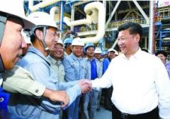 图为习近平总书记(右一)和煤制油一线工人亲切握手。 (鞠鹏 李涛 摄) 7月19日下午,正在宁夏回族自治区视察的中共中央总书记、国家主席习近平来到银川市郊的宁东能源化工基地,考
