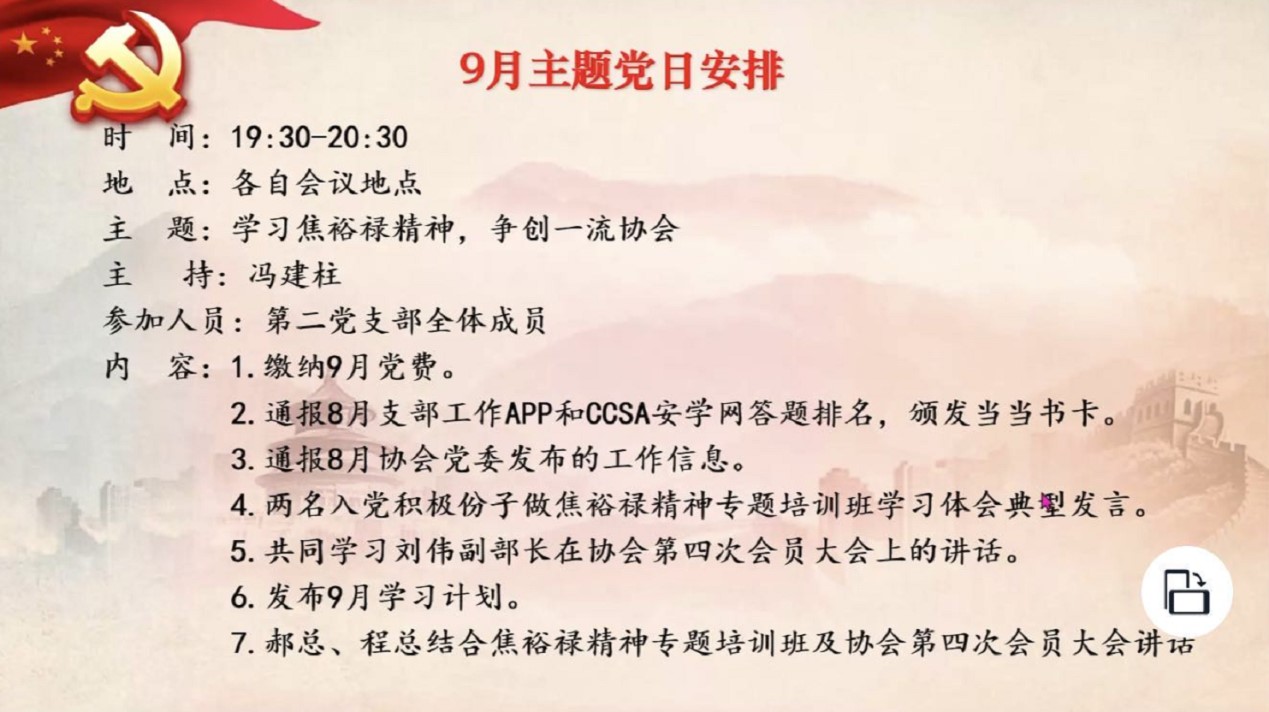 主题党日活动主要通报了8月支部工作APP和微信答题排名,颁发了优秀党小组流动红旗,重点学习了应急管理部副部长刘伟在协会第四次会员大会上的讲话。