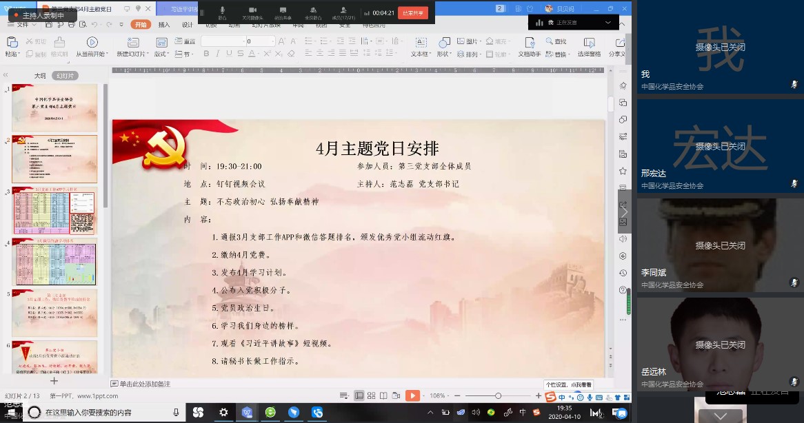 2020年4月10日,中国化学品安全协会第三党支部以钉钉视频会议形式开展主题为“不忘政治初心 弘扬奉献精神”的4月主题党日活动。