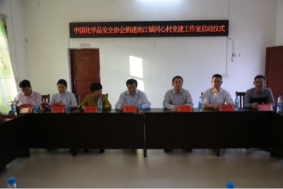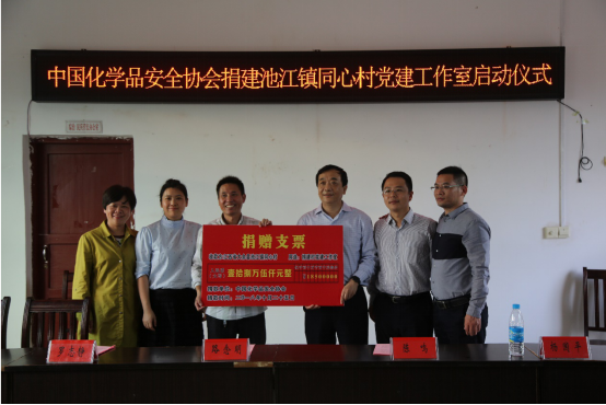 2018年10月25日,中国化学品安全协会党支部书记路念明、组织委员马欣妮,以及大余县县委常委、副县长陈鸣,池江镇党委书记罗志静一行来到了同心村,与村两委班子成员开展工作座谈并举行捐建同心村党建工作室启动仪式,向同心村捐献党建工作室建设资金18.5万元。