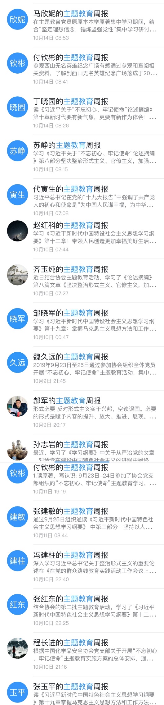 随着中国化学品安全协会“不忘初心、牢记使命”主题教育的不断推进,协会党员纷纷在“钉钉”办公系统上提交了主题教育周报。截至目前,全体党员都分别提交了至少两期主题教育周报,内容也日渐丰富。