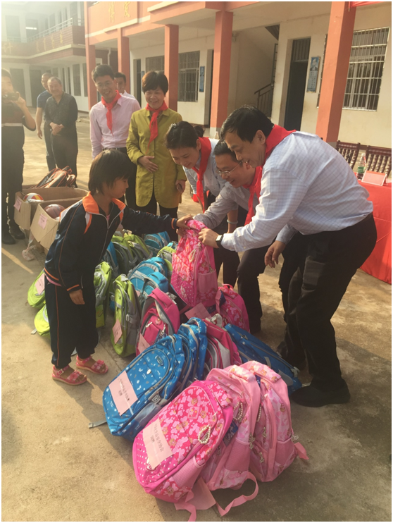 路念明、马欣妮低头弯腰亲切地询问孩子们喜欢的书包颜色,把一个个书包递给孩子们,孩子们脸上洋溢着天真单纯的欢喜,与映照在嘉宾脸上红领巾颜色交相融合,一切皆自然谐合、浑然天成。