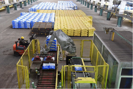 天脊集团全面推进“机器代人”、“机器换人”,实现智能化工厂建设。截至目前,复肥4条包装线全部实现自动化包装生产,在岗位用工人数减半、作业效率加倍提高的同时,有力地降低了用工风险、促进了安全管理。图为自动包装生产线高效运行。