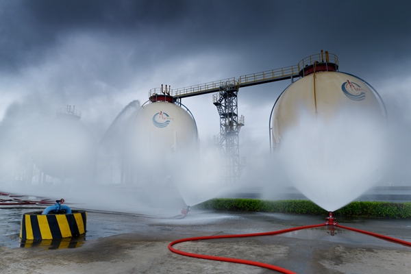 图为演练采用无人遥控灭火喷洒,这在阳江实业尚属首次 7月5日下午,海洋石油阳江实业有限公司组织开展液化石油气储罐泄漏安全事故联合应急演练。参演单位包括阳江市地方安监局、应急指挥中心、公安、消防、交通、高新区管委会等12个单位,共280人观摩演练。 |