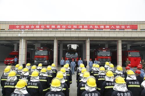 3月20日,中安联合举行消防大队揭牌入驻仪式,煤化工项目消气防站启用,由五十多名专业消防员组成的消防大队正式入驻煤化工现场。中安联合煤化工生产的消气防业务采用外包服务形式,由中国石化河南油田消防支队承揽,为中安煤化工生产提供安全保障。中安联合消气防站经过近一年的建设顺利建成投用,消气防站投用与消防大队入驻,标志着中安联合煤化工项目试生产消气防准备工作已基本就绪,也预示着中安联合与中国石化河南油田的消防合作全面开启。