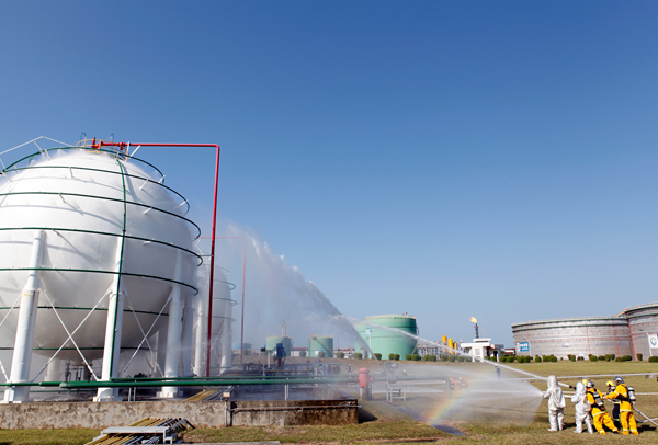 本次演习模拟LPG储罐发生泄漏,警报响起后,终端各应急小组迅速响应,第一时间启动应急预案,联动地方相关部门共克险情。