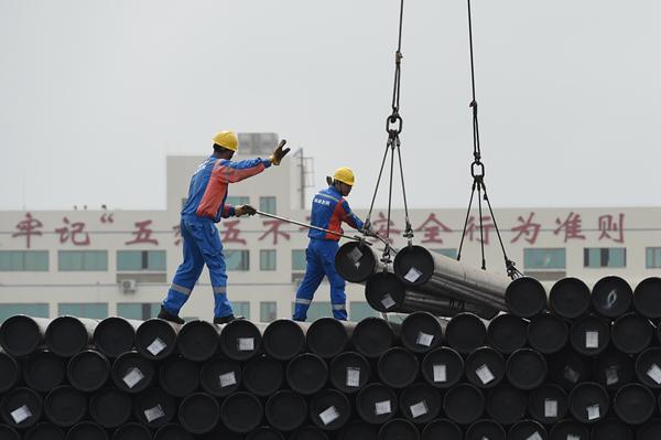 12月4日,海南中海石油码头有限公司物料堆场,工人在吊装套管,这批套管将用于南海陵水区块的钻井作业。该码头于2014年6月投入使用,主要为中国海油在南海西部的海上油气田作业提供物料、后勤等支持,为海上一线实现“保增长”目标提供了有力保障。