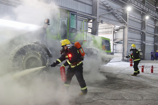 此次演练模拟铲车在冷却棚铲电石时,不慎将电石场地潮湿物铲起,造成热电石堆着火进而引燃铲车。岗位人员发现“险情”后,立即启动应急预案。各小组严格按照演练方案,有条不紊地展开灭火救援工作。警戒组人员协助岗位人员现场警戒,并做好人员紧急疏散工作;同时,消防组人员深入着火现场进行灭火。演练各环节层层推进、紧张有序、重点突出,进一步检验了员工在生产过程中发生火灾时的应急处置能力,达到了预期效果。