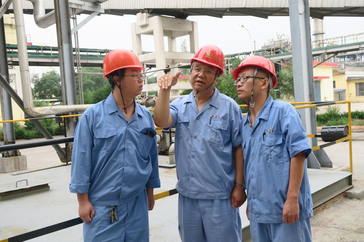 图为8月24日,该公司主管安全生产的副总经理崔慧峰(中)走进硝铵装置现场给生产技术人员讲述安全管控重点。