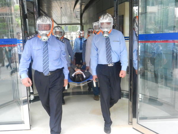 图为东直门海油大厦工作人员正在模拟对火灾受伤人员进行救援和撤离。