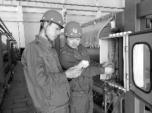 图为仪表工正在对电解槽线缆进行校验检查。