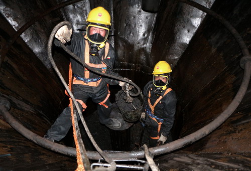 | 施工人员身系安全带,进行清理油泥操作。 |