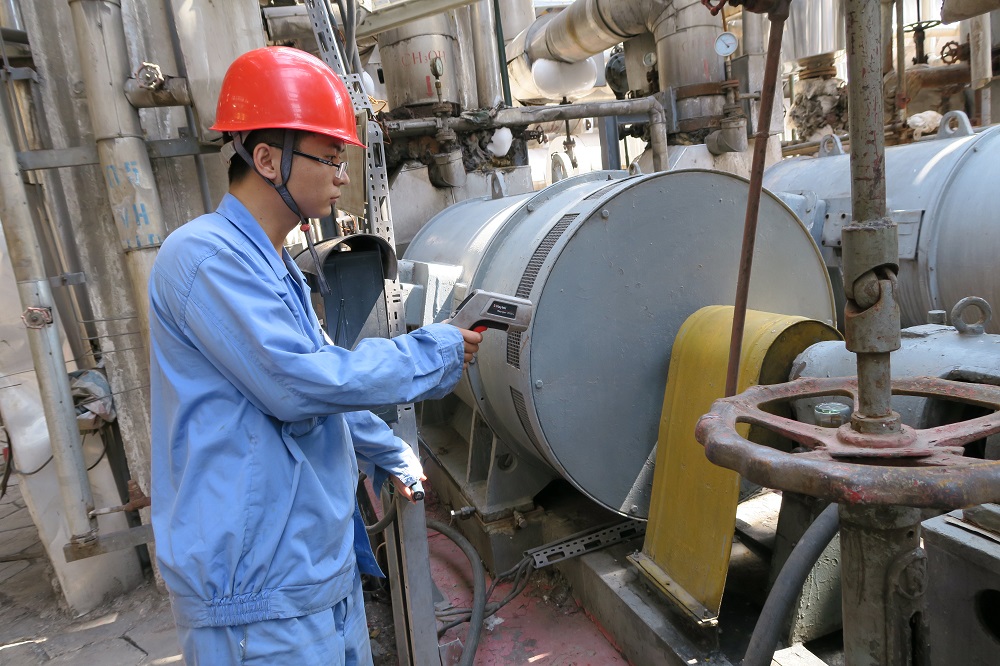图为7月2日合成氨厂操作工刘翔正在对设备测试运行温度。