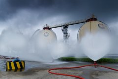 图为演练采用无人遥控灭火喷洒,这在阳江实业尚属首次 7月5日下午,海洋石油阳江实业有限公司组织开展液化石油气储罐泄漏安全事故联合应急演练。参演单位包括阳江市地方安监局
