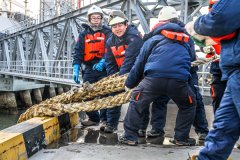 1月14日,卡米拉号LNG船接卸过程中,气电集团天津LNG生产党支部的党员协力将缆绳拖拽至码头上的系缆钩。 近期,由于天气寒冷,缆绳被海水浸透后变得十分沉重,天津LNG的党员们身先