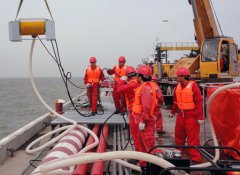 9月7日,冀东油田公司在渤海湾海域开展了南堡油田NP13岛至NP11岛海管溢油综合应急演练。图为中国石油海上应急救援响应中心员工将收油机吊装下海。 ( 张常忠 )