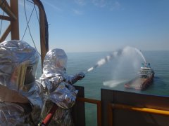 图为平台消防队成员正在联合值守船舶模拟灭火。 4月28日,渤海石油管理局辽东作业公司锦州25-1南油气田联合钻完井方举行了集井控、消防、救逃生为一体的应急演习。 此次演习模拟