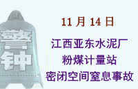 2011年11月14日,该水泥厂粉煤计量站煤仓检修过程中,发生窒息事故,造成4人死亡,6人受伤。