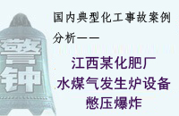 一、事故经过和危害 1994年4月19日9时30分,江西省丰城某化肥厂6号水煤气发生炉在使用过程中发生爆炸,致使数吨重的炉体倾塌,700kg重的炉条机碎块炸飞至距炉体13m远处,事故造成4人