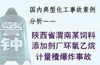 2000年7月10日12时20分,陕西省渭南某饲料添加剂厂内一环氧乙烷计量槽突然开裂,致使液态环氧乙烷喷出汽化,发生大爆炸。事故造成2人死亡,4人重伤,11人轻伤,直接经济损失640万元