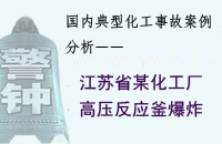 国内典型化工事故案例分析 江苏省某化工厂高压反应釜爆炸 1991年10月8日6时50分,江苏省某化工厂发生高压反应釜爆炸事故,事故造成3人死亡。 一、事故经过 1991年10月8日6时50分,江苏