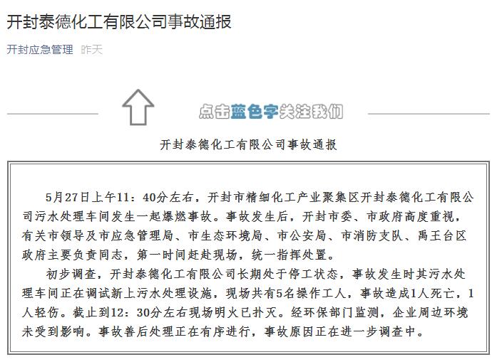 开封市应急管理局发布事故通报称, 5月27日上午11:40分左右,开封市精细化工产业聚集区开封泰德化工有限公司污水处理车间发生一起爆燃事故。事故发生后,市应急管理局、市生态环境局、市公安局、市消防支队、禹王台区有关部门第一时间赶赴现场处置。