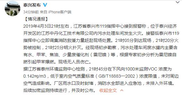 中共泰兴市委宣传部官方微博“泰兴发布”消息,2019年4月3日21时左右,江苏省泰兴市119指挥中心接到报警称,位于泰兴经济开发区的江苏中丹化工技术有限公司内污水处理车间发生火灾。