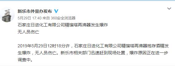 2019年5月29日12时18分许,石家庄日进化工有限公司精馏塔再沸器残存酒精发生爆炸,无人员伤亡。新乐市相关部门迅速赶到现场处置,爆炸原因正在进一步调查中。