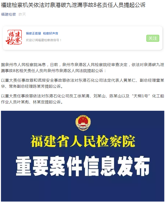 福建省人民检察院官方微信12日发布消息,泉州市泉港区人民检察院日前经审查决定,依法对泉港碳九泄漏事故8名相关责任人员向泉州市泉港区人民法院提起公诉。
