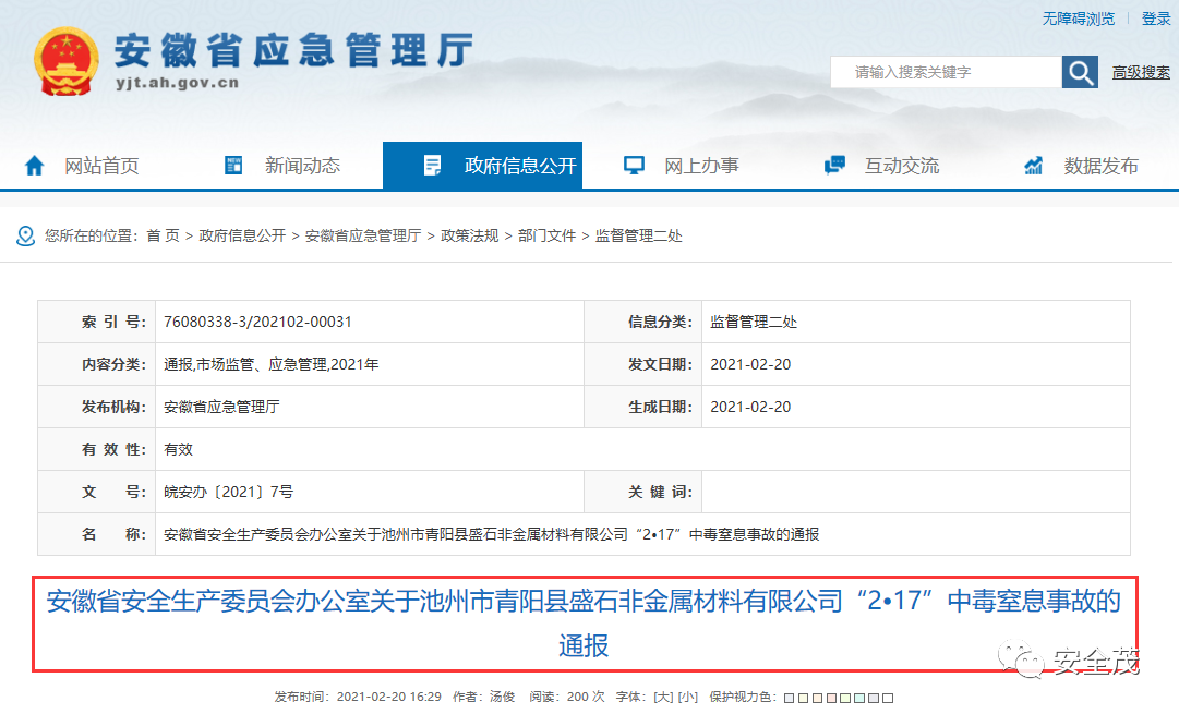 关于安徽池州“2.17”有限空间中毒窒息致2死1伤的事故通报
